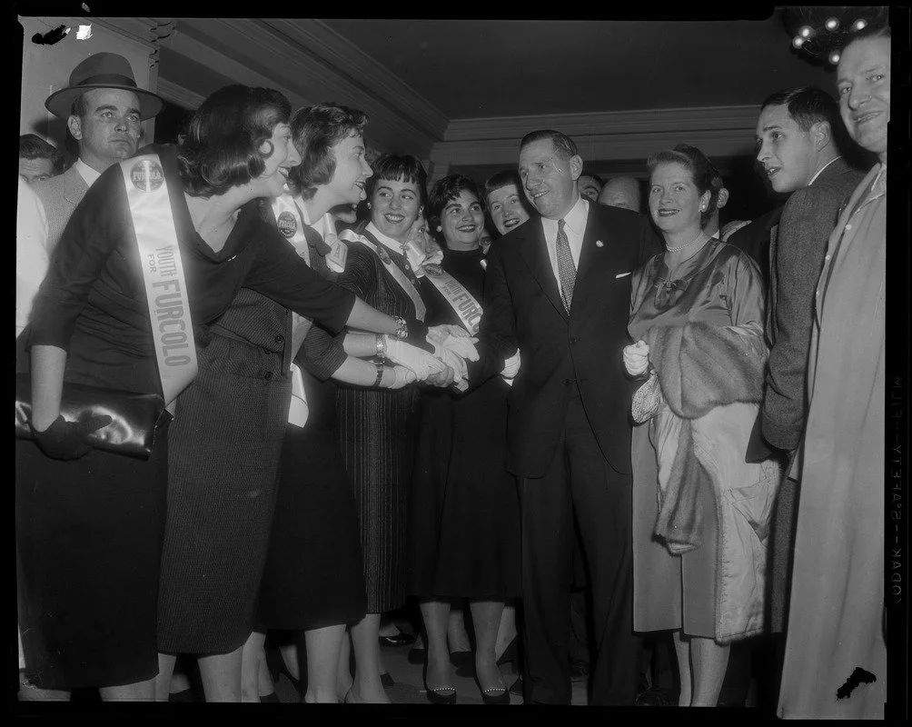 Photo: Foster Furcolo and his wife Kay shake hands with female supporters while campaigning for governor in 1956. Courtesy of Boston Public Library.